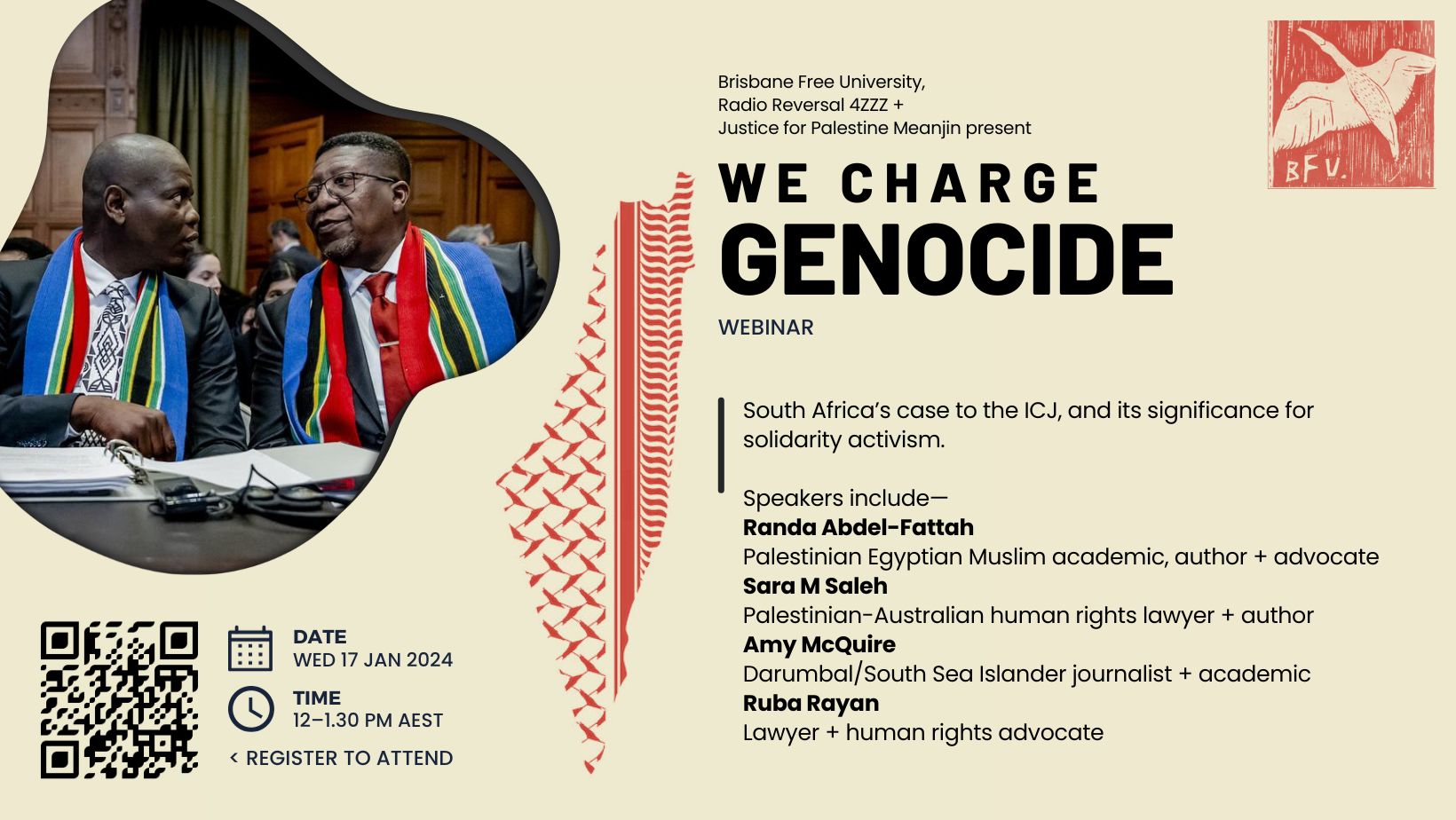 Join Brisbane Free University, Justice for Palestine – Meanjin & Radio Reversal – 4zzz for a free, public discussion and live podcast recording as we try to understand the significance of South Africa’s case to the International Court of Justice in the Hague.